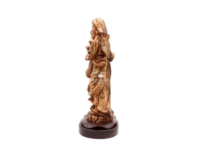 Denne vakkert håndskårne statuen av Jomfru Maria med Jesusbarnet er laget av ekte oliventre og viser det kjærlige båndet mellom mor og barn. De fine detaljene i utskjæringen, som er laget i Betlehem, fremhever ømheten og hengivenheten i dette hellige øyeblikket, noe som gjør den til et høyt skattet religiøst kunstverk.